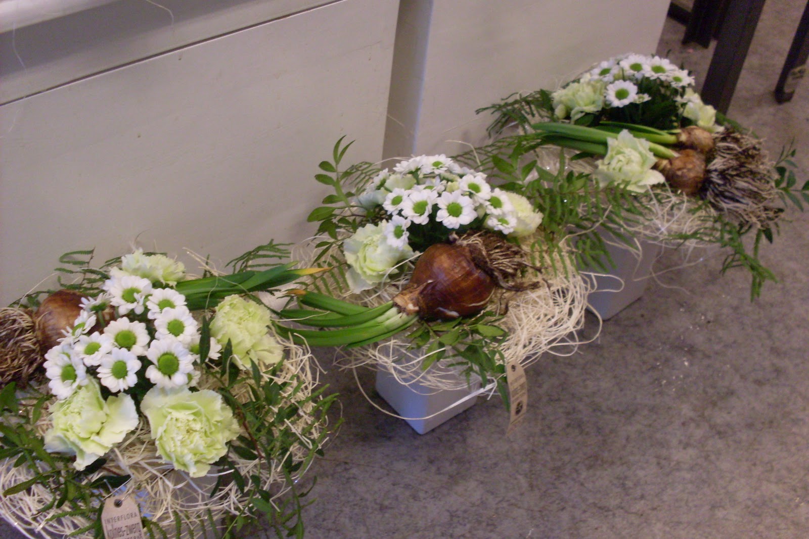 3 små dekorasjoner med nellik, krysantemum og pistacia. Urnen var pyntet med sisal. Disse kostet 100kr pr.Disse inneholdt vanda orkide, krossved (viburnum), sand og bjørnegress. De kostet 150kr.